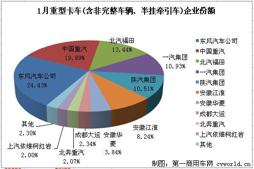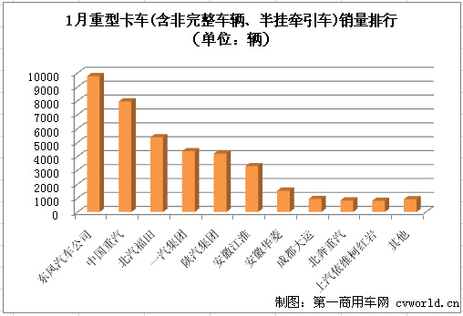 1月重型卡車(含非完整車輛、半掛牽引車)銷量排行(單位:輛)