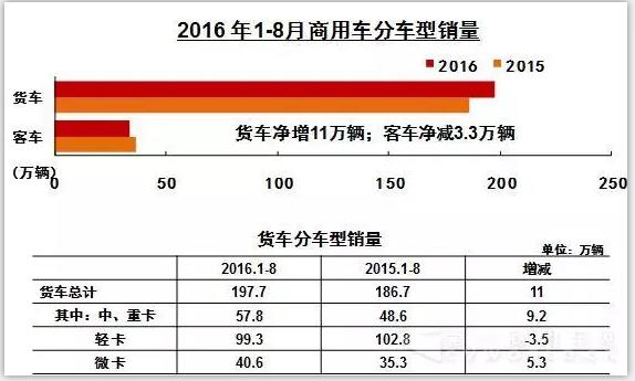 2016年1-8月,貨車(chē)產(chǎn)銷(xiāo)196.46萬(wàn)輛和197.71萬(wàn)輛,同比增長(zhǎng)6.52%和5.92%。其中:重型貨車(chē)產(chǎn)銷(xiāo)43.34萬(wàn)輛和43.94萬(wàn)輛,同比增長(zhǎng)19.52%和19.74%;中型貨車(chē)產(chǎn)銷(xiāo)13.89萬(wàn)輛和13.88萬(wàn)輛,同比增長(zhǎng)18.56%和16.52%;輕型貨車(chē)產(chǎn)銷(xiāo)98.62萬(wàn)輛和99.31萬(wàn)輛,同比下降3.92%和3.35%;微型貨車(chē)產(chǎn)銷(xiāo)40.61萬(wàn)輛和40.58萬(wàn)輛,同比增長(zhǎng)20.11%和14.95%。