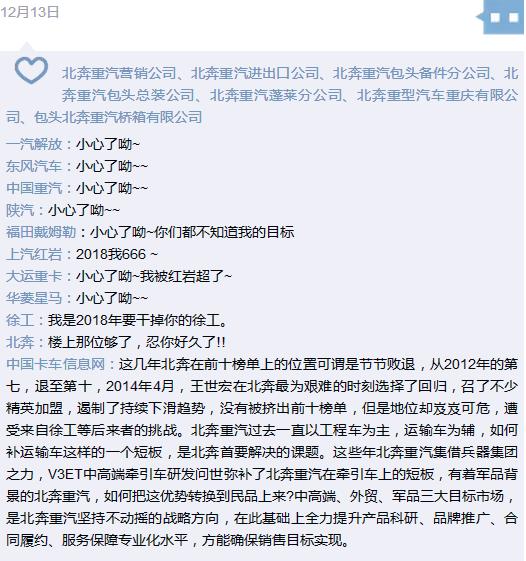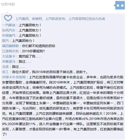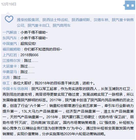 對(duì)于來(lái)年市場(chǎng)大多都是看好的,謹(jǐn)慎點(diǎn)的企業(yè)預(yù)測(cè)80-90萬(wàn)輛,樂(lè)觀點(diǎn)的企業(yè)認(rèn)為可能在90—100萬(wàn)輛。 在此基礎(chǔ)上,各大重卡企業(yè)紛紛曬出了2018年目標(biāo),如果他們都發(fā)朋友圈會(huì)是怎樣?