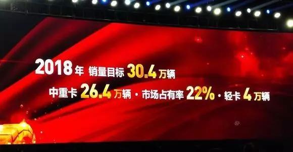 2018年老大非我莫屬:2018年沖刺年銷(xiāo)30.4萬(wàn)輛的目標(biāo)。其中中重卡26.4萬(wàn)輛,市場(chǎng)占有率22%,輕卡4萬(wàn)輛,備品銷(xiāo)售30億元。