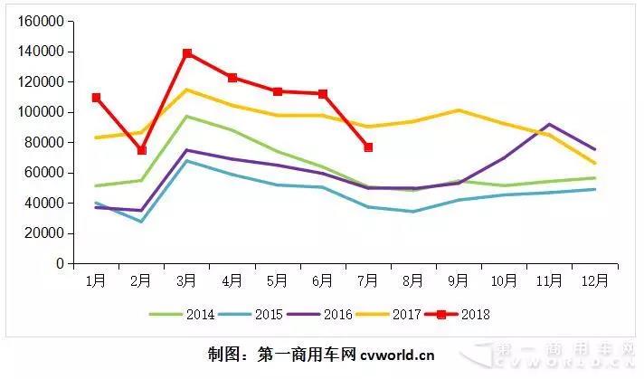 從2018年初至今,我國重卡市場在七個月的時間里,有五次刷新月度銷量紀(jì)錄(分別是1月、3月、4月、5月和6月),3月份市場還以13.89萬輛創(chuàng)造了重卡市場月度銷量的歷史新高;有兩次出現(xiàn)同比下降,其中一次是2月份,當(dāng)月市場銷量同比下滑13%,還有一次便是剛剛過去的7月份,月銷量同比下滑15%。