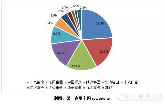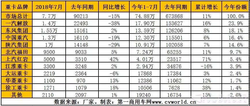 從競爭格局來看,一汽解放7月份銷售重卡1.4萬輛,前七月累計銷售17.9萬輛,同比增長16%,市場份額23.9%,今年累計銷量繼續(xù)保持行業(yè)第一。第二名東風(fēng)重卡7月份銷售1.55萬輛,同比上漲2%;1-7月累計銷售13.59萬輛,同比增長8%,市場占有率為18.1%。