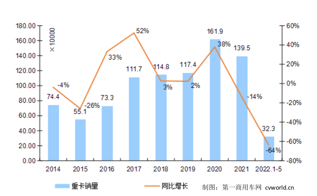 5月份過(guò)后,2022年1-5月的重卡市場(chǎng)累計(jì)銷(xiāo)售32.3萬(wàn)輛,比上年同期的88.7萬(wàn)輛下降64%,減少了56.4萬(wàn)輛。