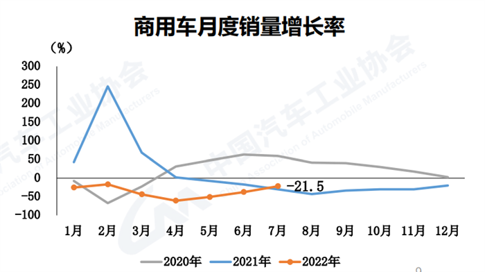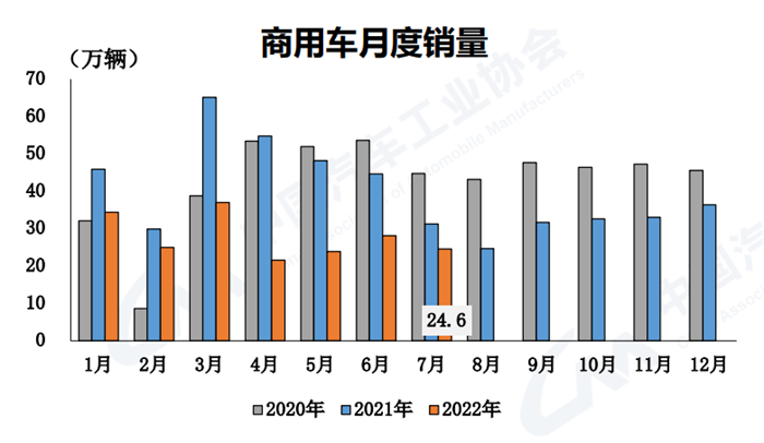 7月,商用車產(chǎn)銷24.4萬輛和24.6萬輛,環(huán)比下降6.2%和12.5%,同比下降22.9%和21.5%,降幅較上月分別收窄10.3和15.9個百分點;1-7月,商用車產(chǎn)銷192.7萬輛和194.8萬輛,同比下降36.9%和39.3%,降幅較1-6月繼續(xù)收窄。