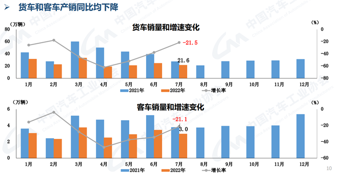 具體來看,貨車方面,7月銷量為21.6萬輛,同比下降21.5%;1-7月,貨車累計銷量為173.8萬輛,同比下降40.1%。客車方面,7月銷量為3萬輛,同比下降21.1%;1-7月,累計銷量為21萬輛,同比下降29.1%。